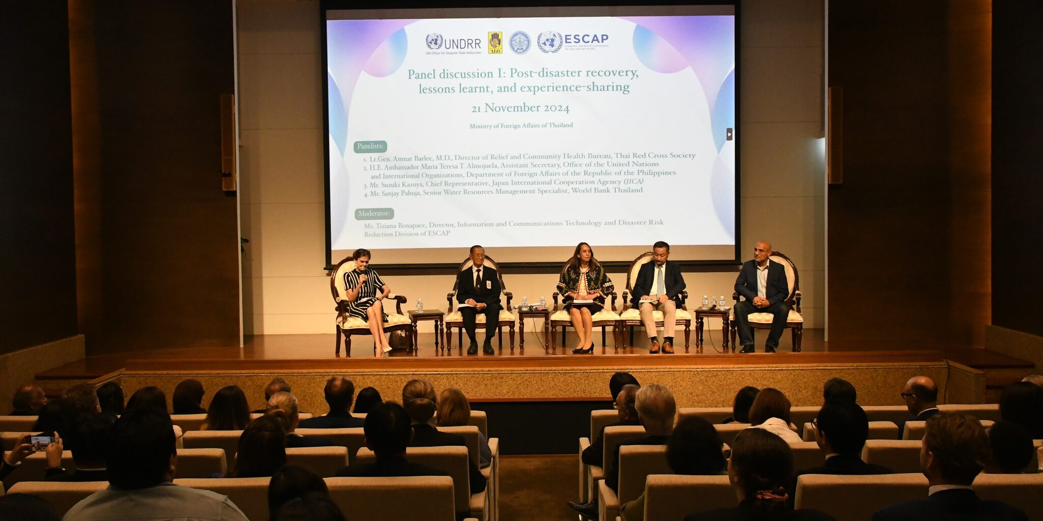 On 21 November 2024, Thai Red Cross Society delegates attended the commemoration event “20 Years on: Remembering the 2004 Indian Ocean Tsunami” at the Ministry of Foreign Affairs. Lt. Gen. Amnat Barlee, M.D., Director of Relief and Community Health Bureau (RCHB), was one of the panelists in the discussion on the topic: “Post-disaster recovery, lessons learnt, and experience sharing”, which aimed to raise awareness on disaster reduction, especially early warning systems, building community resilience, and Asia-Pacific disaster collaboration, on the occasion of Thailand’s contribution to the UNESCAP Multi-Donor Trust Fund for Tsunami, Disaster, and Climate Preparedness.